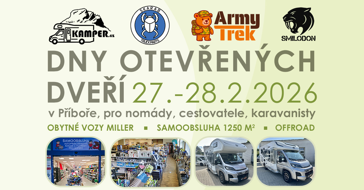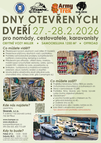 Čeká vás prezentace nově rozšířené samoobslužné prodejny, nabídka pro řidiče i rozšířený sortiment pro karavaning/kemping/outdoor, dále obytné vozy Miller a prezentace půjčovny Kamper.cz.