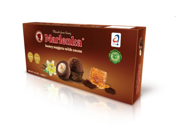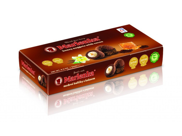 Medové kuličky vycházejí z receptury medového dortu MARLENKA. V jednom soustu si můžete vychutnat vyváženou konzistenci vláčného těsta, mléčného krému a chuť výběrového kakaa. Produkt je rovněž bez GMO. Pro svou výjimečnou kvalitu a originalitu byly Medové Kuličky MARLENKA® s kakaem oceněny značkou národní kvality KLASA.Více informací
